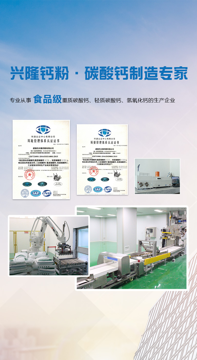 杭州鑫隆新材料有限公司是一家专业从事重质碳酸钙、轻质碳酸钙、氢氧化钙的生产企业,公司拥有优质丰富的自备矿山,年产碳酸钙系列产品5万余吨,产品广泛用于食品、塑料、橡胶、造纸、涂料等行业。